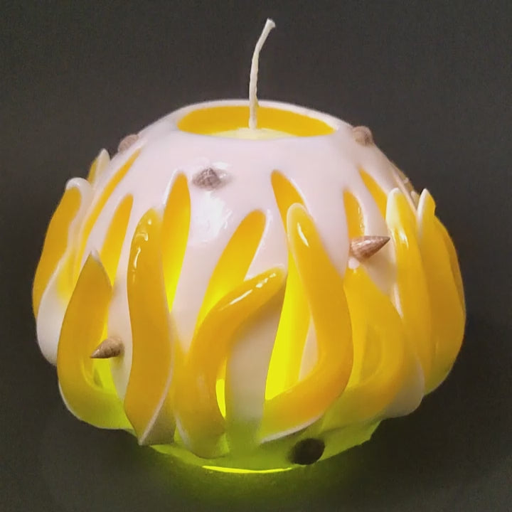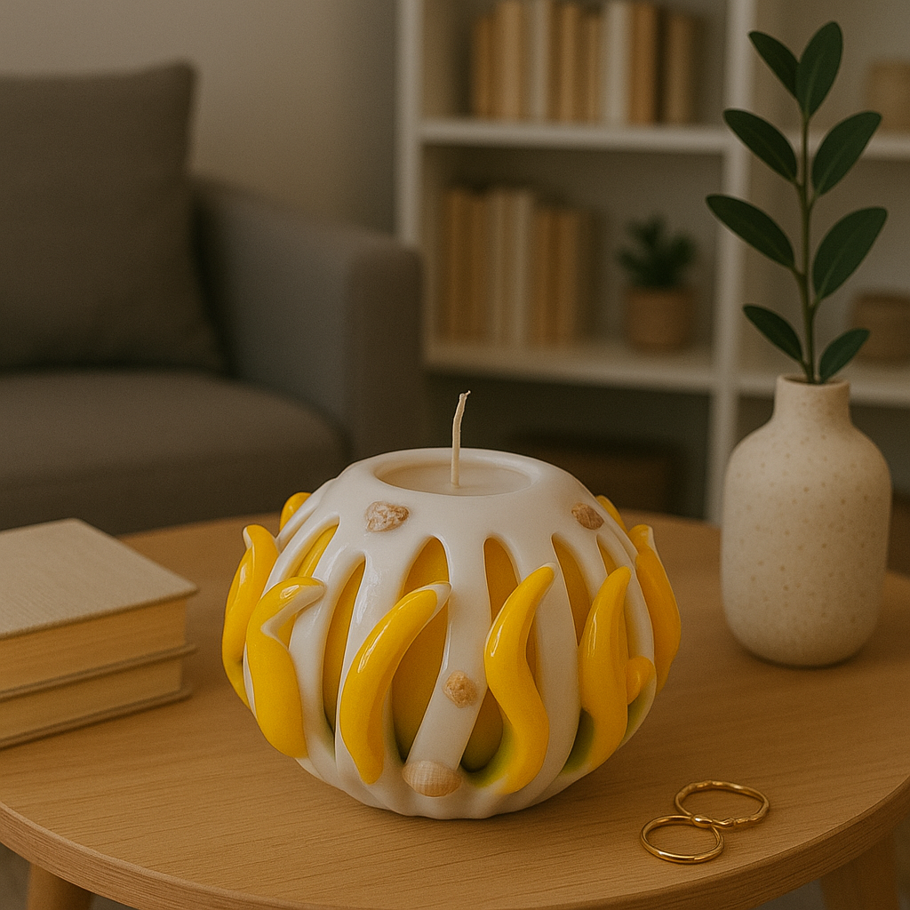 Ročno izdelana sveča v toplih tonih rumene in bele. Mehka, prijetna in elegantna izbira za vsak dom.