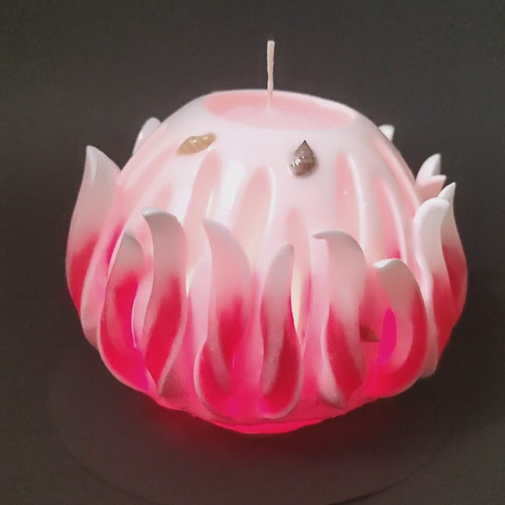 Unikatna bela sveča z rdečimi poudarki in školjkami. Ročno izdelana za posebne priložnosti ali praznično okrasitev doma.
